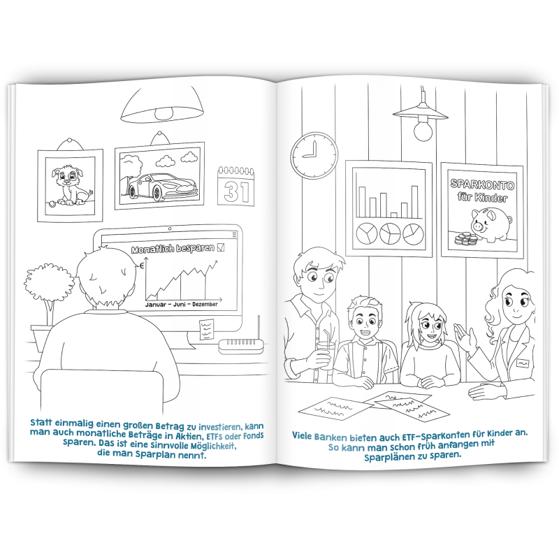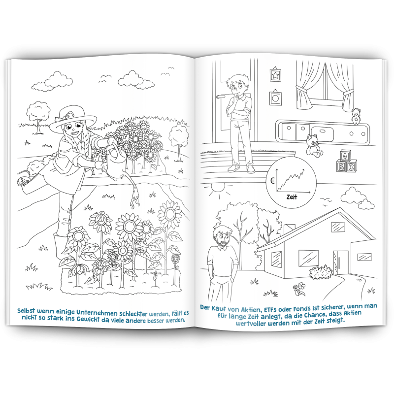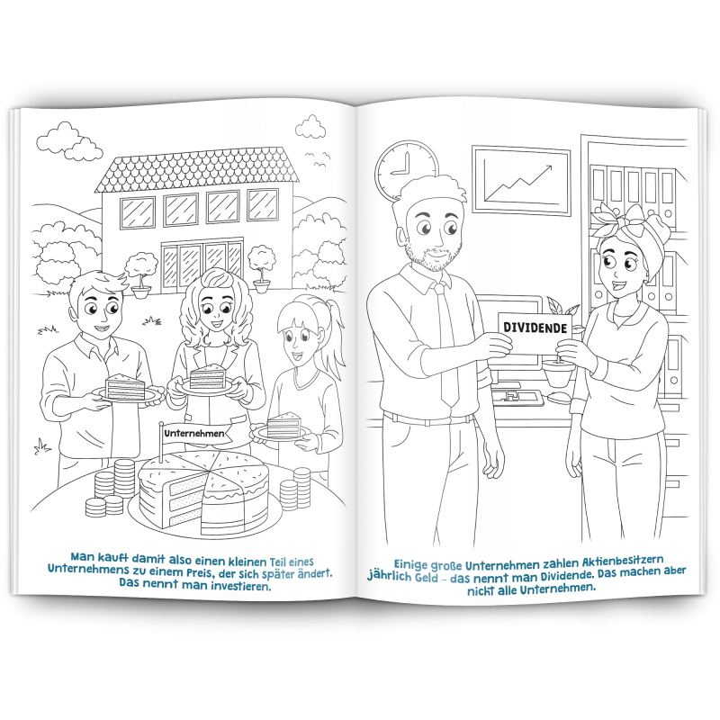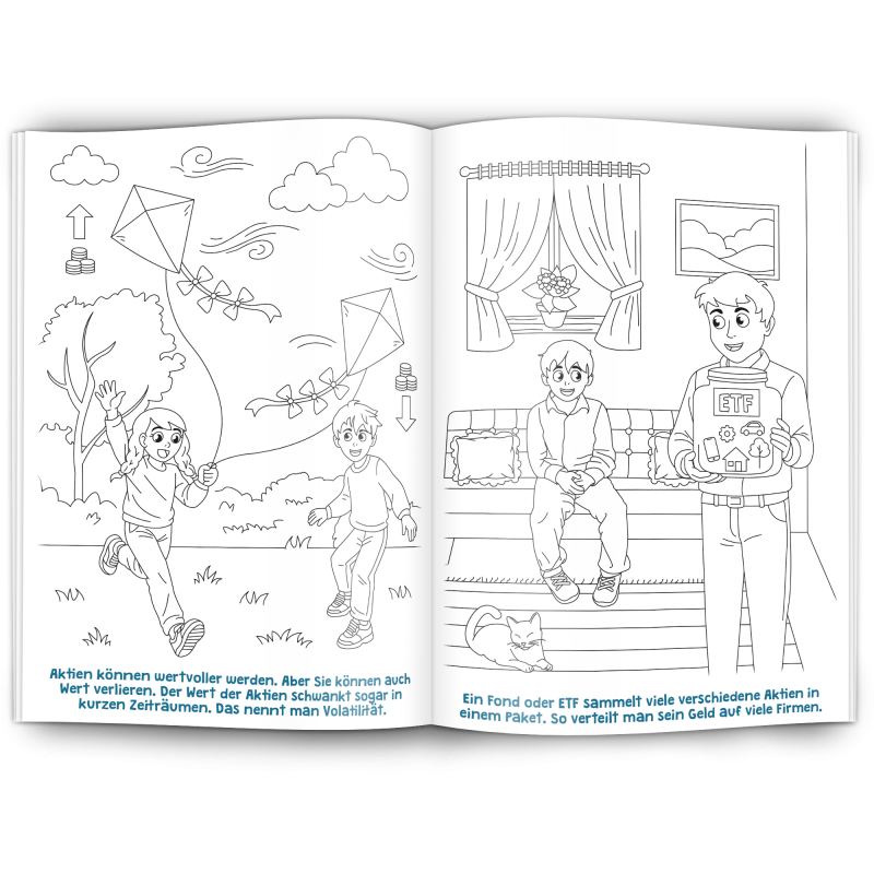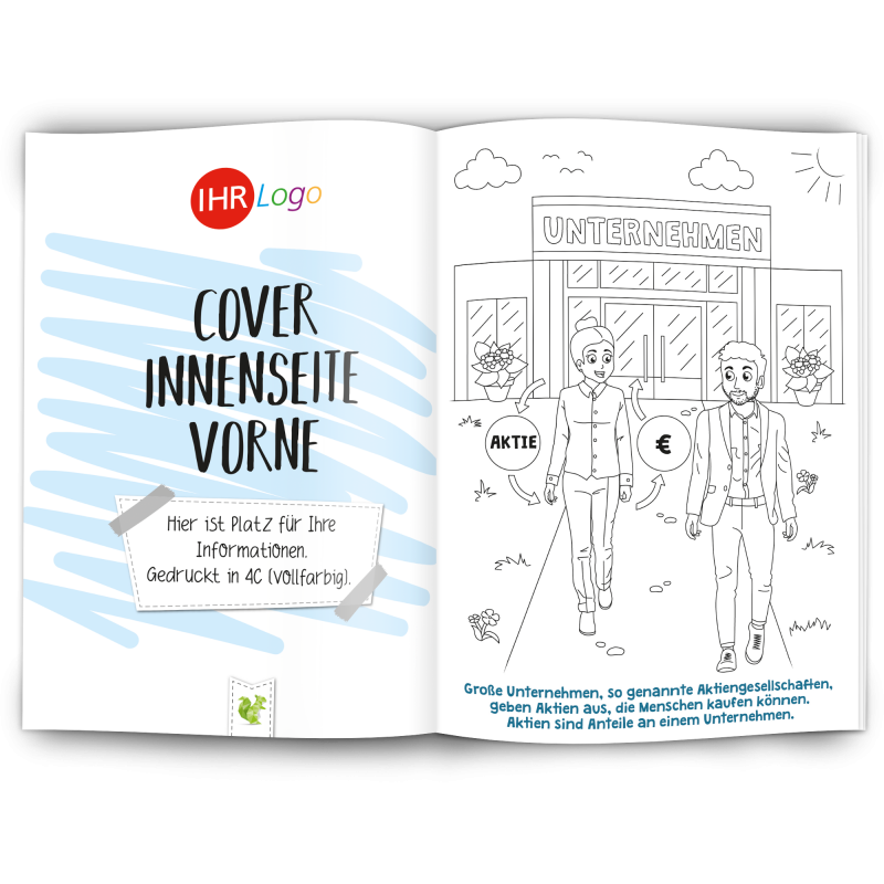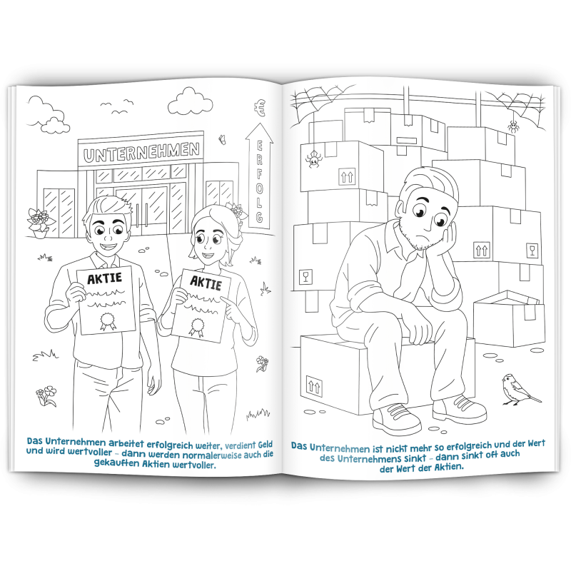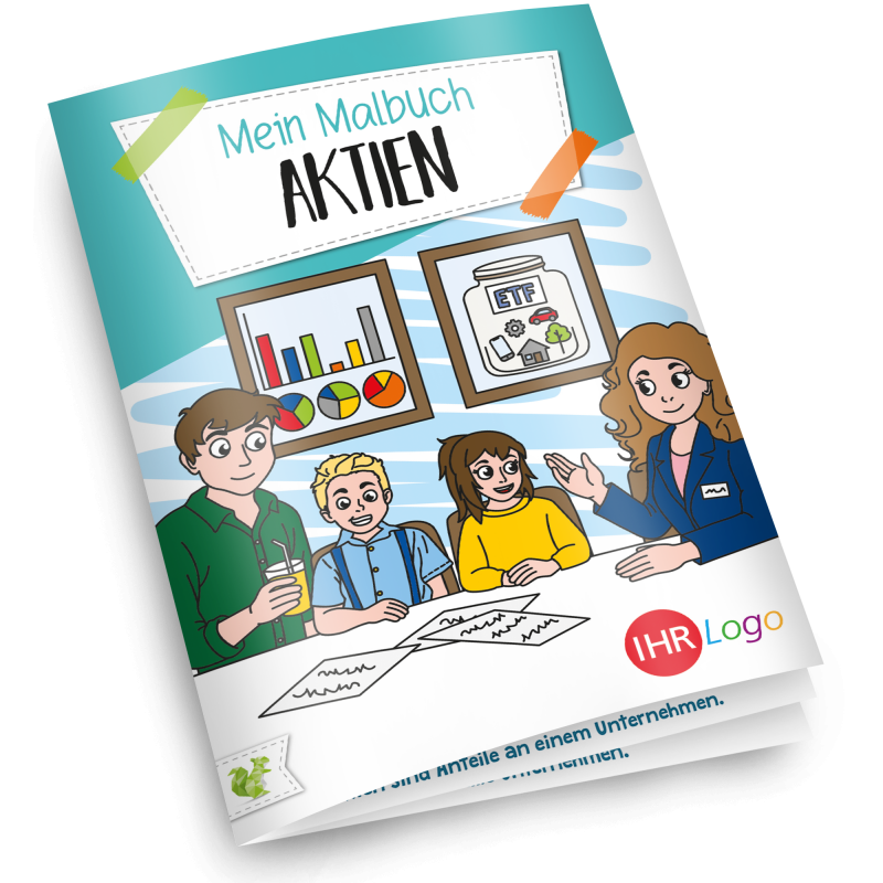 Unser Malbuch "AKTIEN" ist ein toller, edukativer Werbeartikel für Banken, Sparkassen, Finanzdienstleister, Bausparkassen und Kreditinstitute und Börsen.