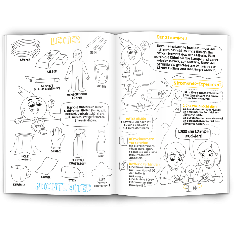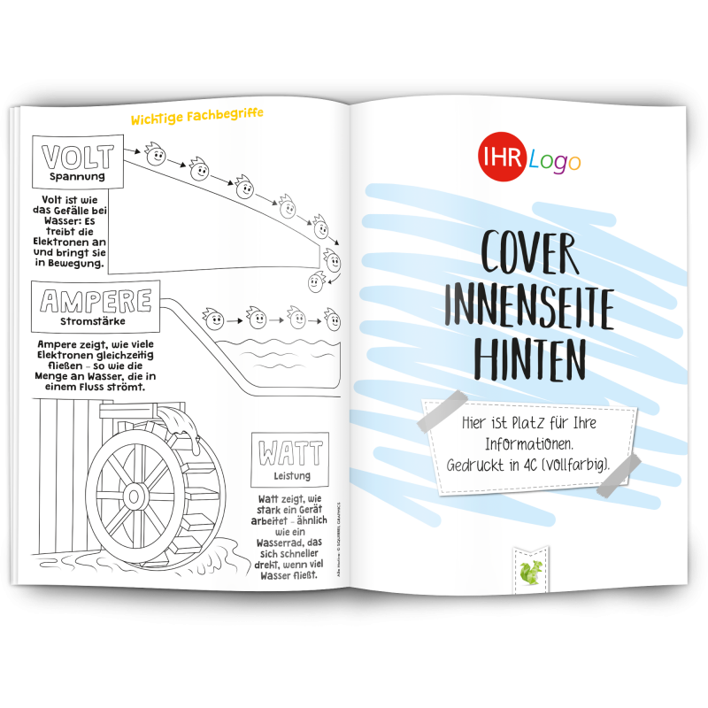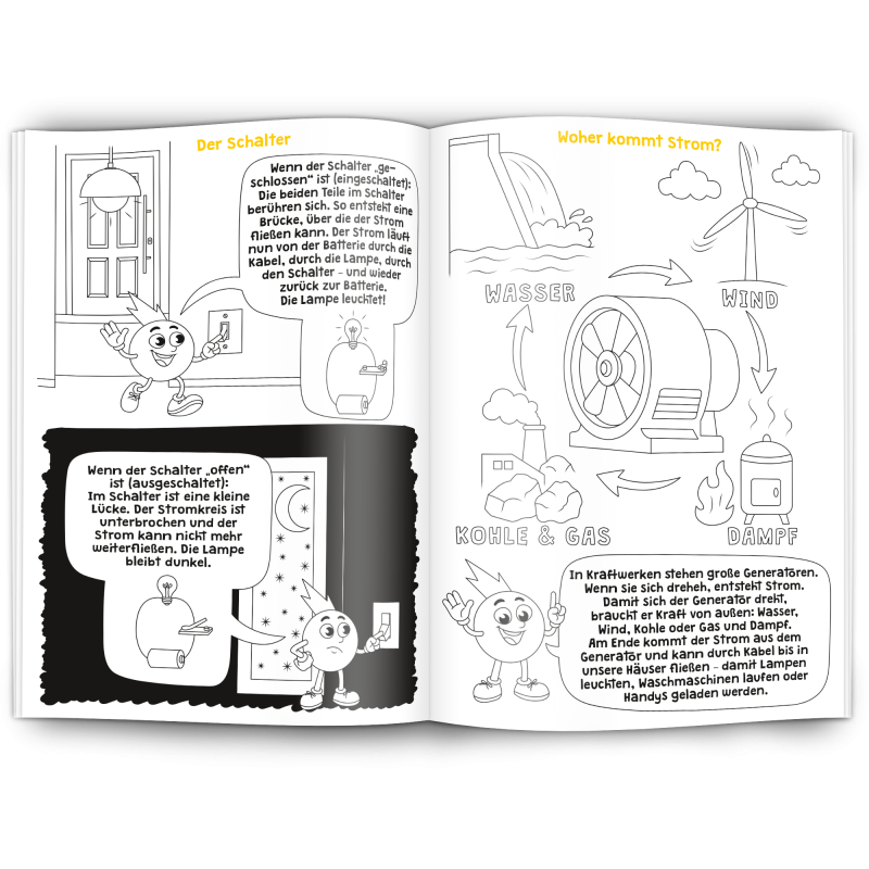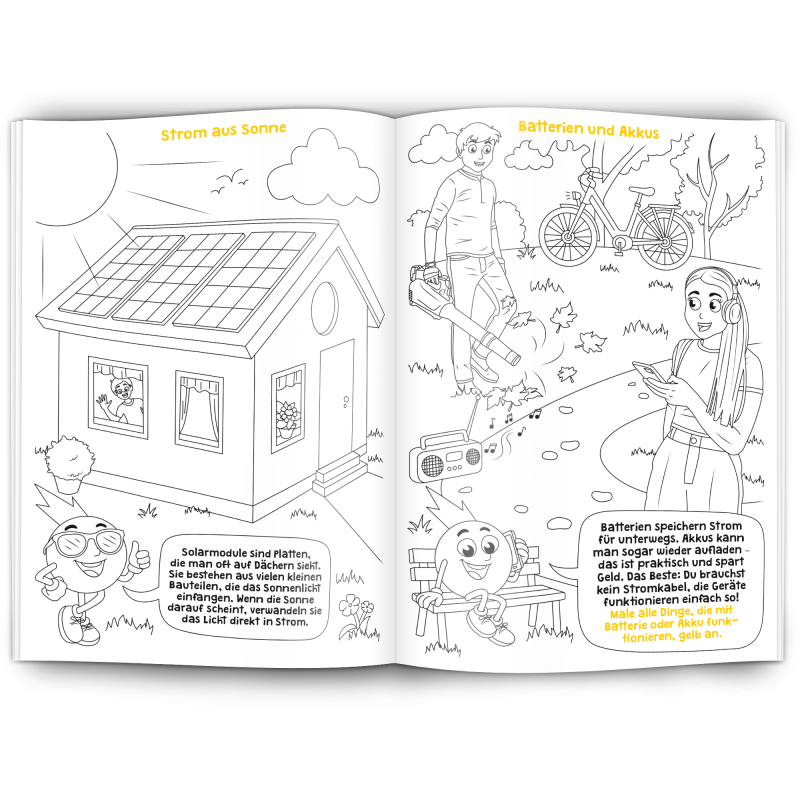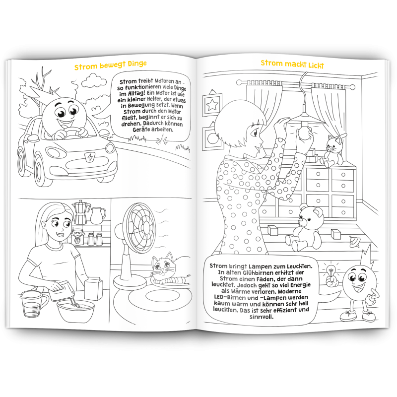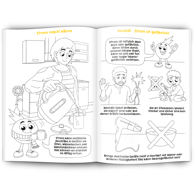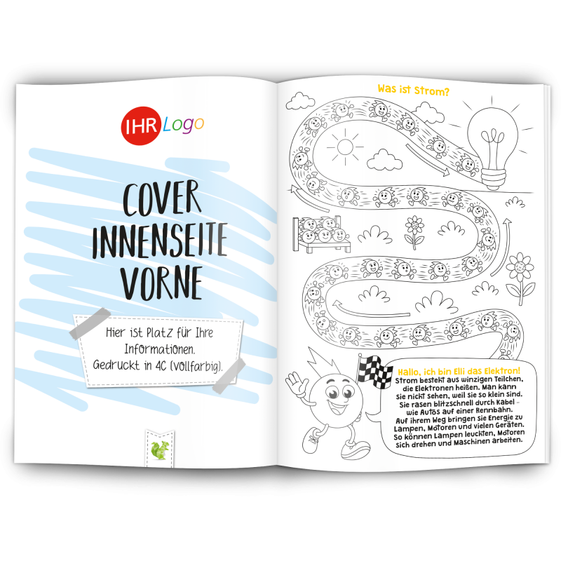 Unser Malbuch "Elektrizität" erklärt spielerisch und kindgerecht was Elektrizität ist und wie Strom funktioniert. Es ist ein edukativer Werbeartikel für Elektrobetriebe, Stromanbieter, Stadtwerke, Elektriker und alle die mit Elektrizität zu tun haben.