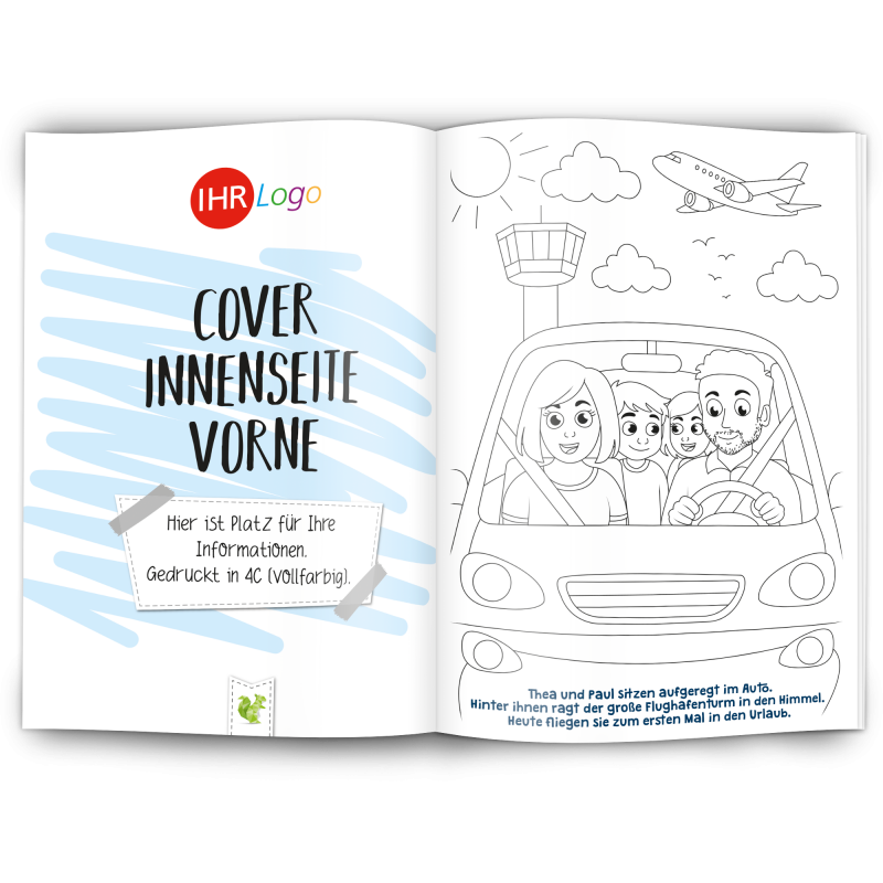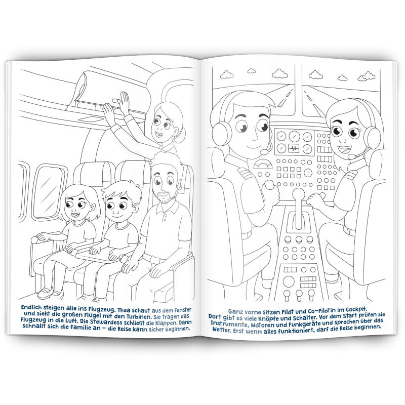 12 Seiten Inhalt mit 12 tollen Flughafen-Motiven, 1C schwarz gedruckt auf wertigem 120 g/m² Offsetpapier weiß.