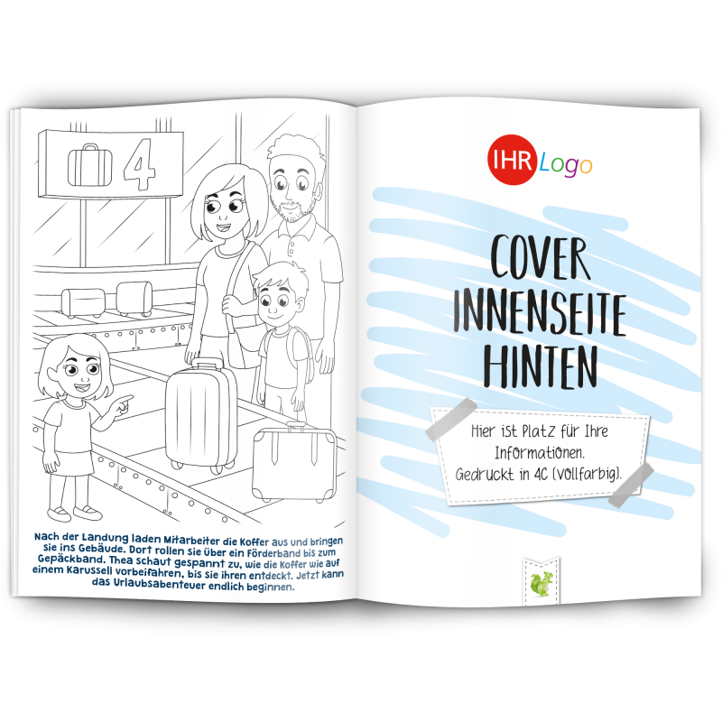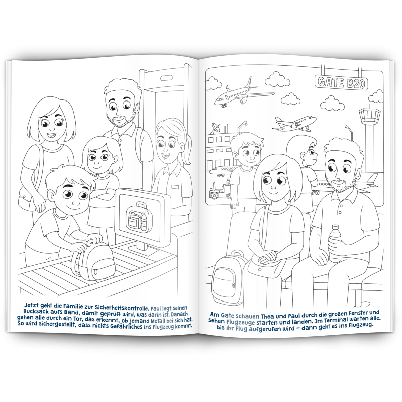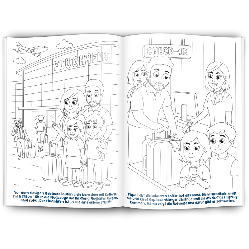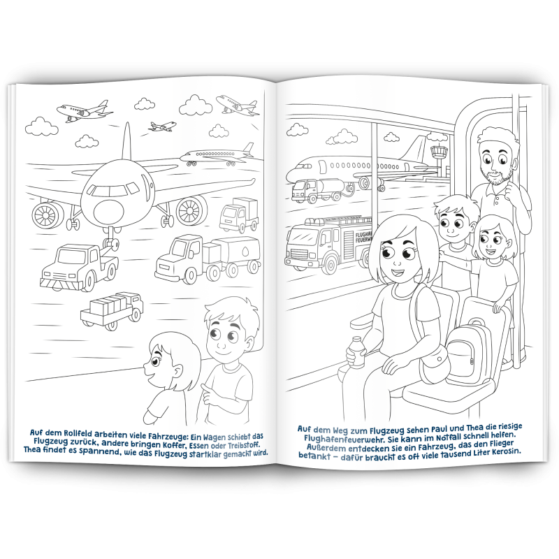 Unser Malbuch "FLUGHAFEN" mit Erklärungen ist ein toller Werbeartikel für Flughäfen, Reisebüros, Reiseveranstalter, Fluglinien, Airlines, Fluggesellschaften und alle Flughafen-Dienstleister in dem der Ablauf am Flughafen kindgerecht erzählt wird.