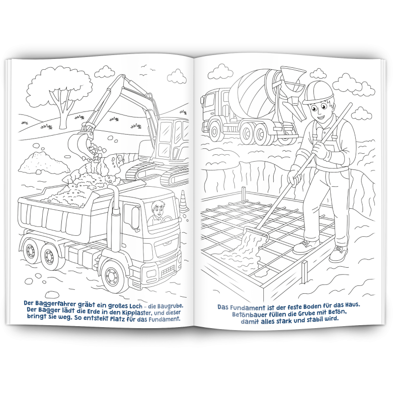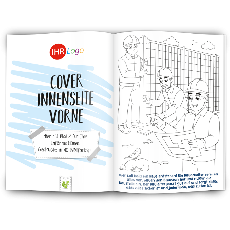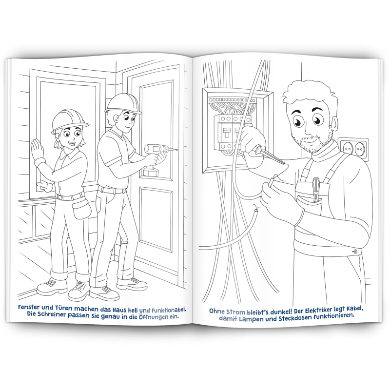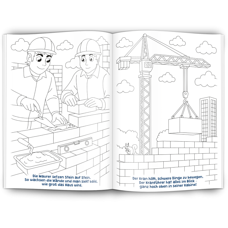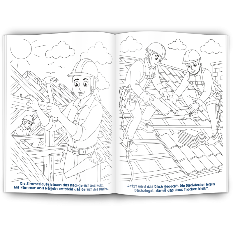 Unser Malbuch "HAUSBAU" ist ein toller Werbeartikel für das Baugewerbe, Baubetriebe, Maurer, Gerüstbauer, Fliesenleger, Dachdecker, Architekten, Tiefbau, Straßenbau, Hochbau, Schreiner, Berufsgenossenschaften, Immobilenentwickler Hersteller von Arbeitskleidung und Schutzkleidung und alle Werbenden mit Bezug zum Baugewerbe.