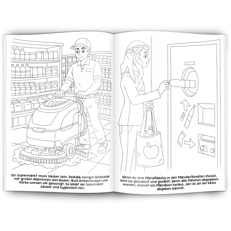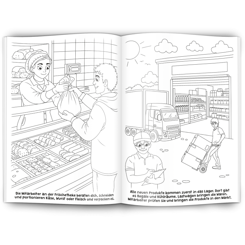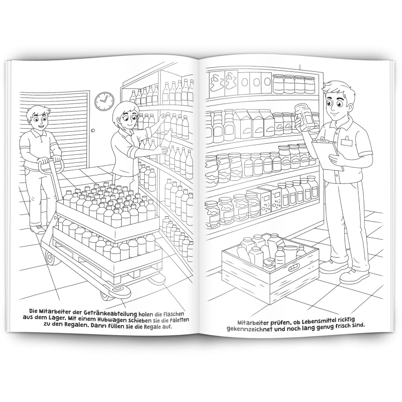 12 Seiten Inhalt mit 12 tollen Supermarkt-Motiven, 1C schwarz gedruckt auf wertigem 120 g/m² Offsetpapier weiß.